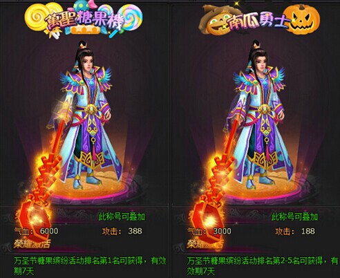 活动说明:活动期间,万圣节不给糖就捣乱,请各位仙将收集万圣糖果喂食南瓜怪,点亮南瓜灯。每点亮一个南瓜灯可额外获得专属礼包奖励。活动结束时,喂食糖果个数排名前五的玩家分别可获得万圣节专属称号奖励。