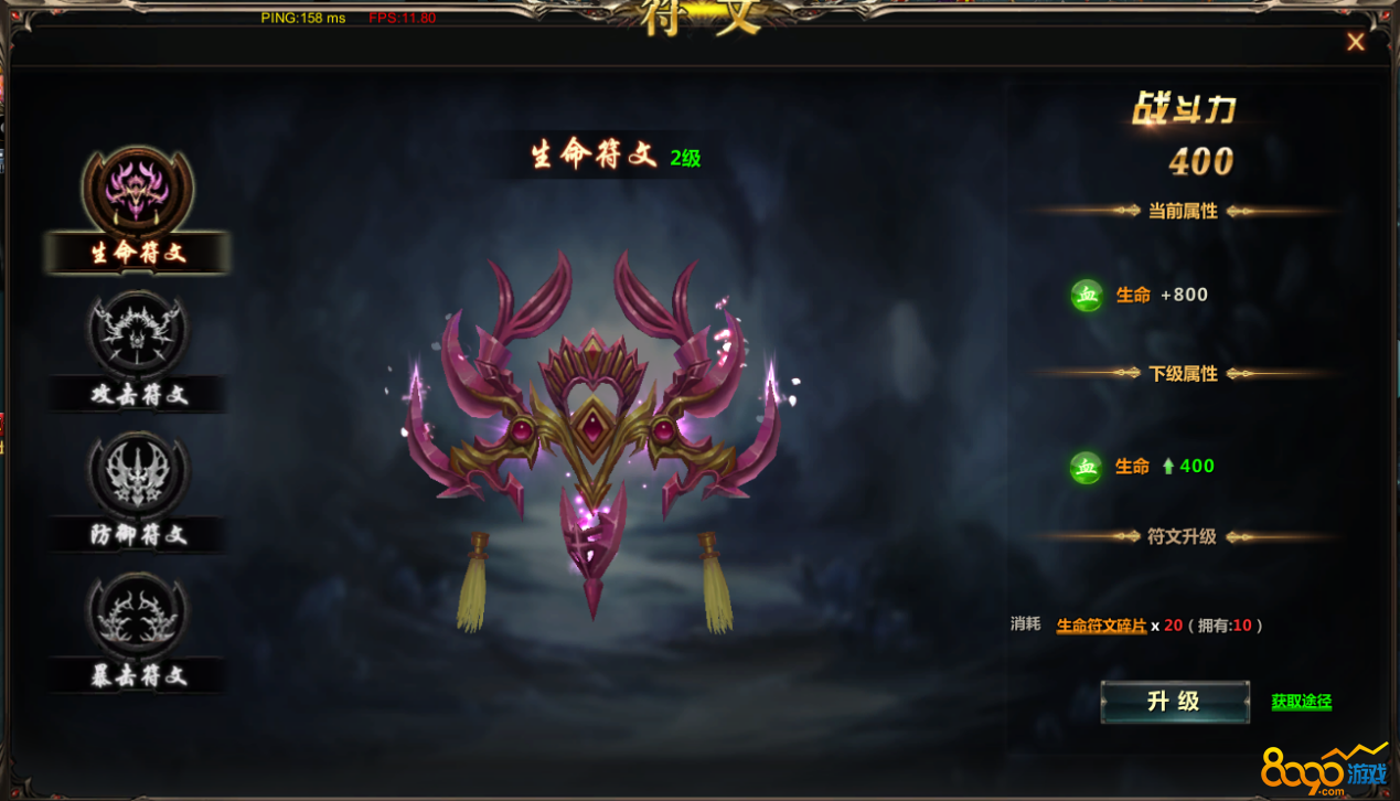 玩家达到一定等级开启铭文系统,铭文分为生命铭文、攻击铭文、防御铭文和暴击铭文。玩家可以收集不同的碎片来激活和升级不同的铭文。