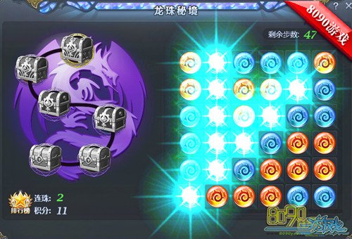 当玩家人物到达20级即可开启龙珠秘境,鼠标移动到界面上方“休闲”,点击【龙珠秘境】,只有两种不同颜色的龙珠,连成5个可以消除,但是有50个步数限制,因此想要开到后面的宝箱还是难度很高啊,不过玩家可以花钻石来多买步数。