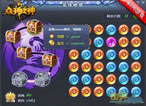 开启于英雄角色等级20级的“龙珠秘境”,在8090众神之神的世界中算是规则简单的一类玩法,但是如果你以为规则简单就容易过,那你就大错特错了。因为虽然以简单的消除玩法为基本规则,只要点击龙珠变色,消耗步数,在行或者列之间形成5连同步,便能够引起爆炸获得积分,但是想要在消耗最少步数的情况下引发最大的爆炸效果,获得最高的分值,那就一点儿也不容易了哦!