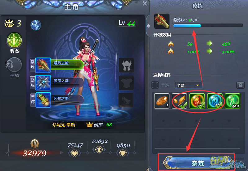 注:装备祭炼只是对这个部位进行祭炼强化,并不针对某一件装备(所以在获得新的人物装备,直接可替换)