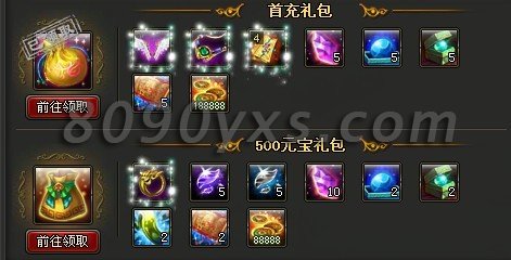 500龙纹·戒指*1、龙纹碎片*5、皓月碎片*5、紫色洗练石*10、灵宠潜力丹*2、灵宠成长丹*2、根骨成长符*2、星空宝图*2、绑定铜钱*88888