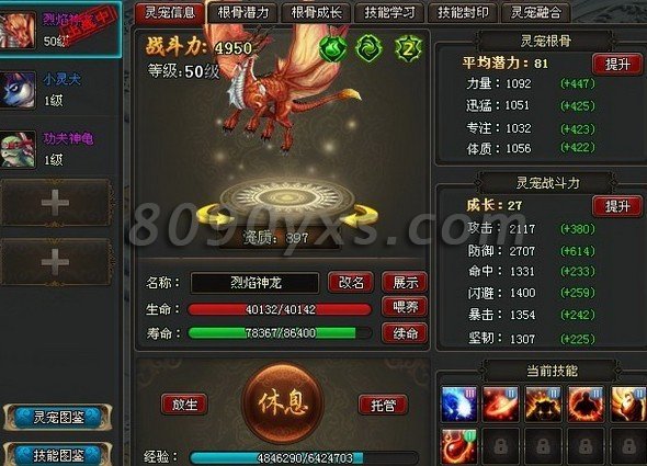 宠物养成。宠物作为8090遮天2中的一个重要玩法,也是大家追求的重点。宠物不仅仅是带着拉风,更是战力和战斗的主力。宠物资质、宠物成长、宠物技能,宠物潜力、宠物融合,宠物图鉴等,好好弄清楚,就可以打造一个属于你的强大宝宝啦!