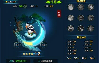 每个宠物都自带一个本源技能,威力强大而且各具特色,还能随着战斗经验的增长而变得愈加强大。夫熊猫头上戴着斗笠,脚上穿着布鞋,腰间上别着一个葫芦,身上穿的布袍因为肥大的肚子而变形,显得非常可爱。