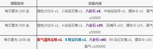 开服时间<1月13号的服务器内的全体玩家在活动期间都能获取宝箱,在活动期间每天累计充值达100金、500金、1000金可分别领取相应奖励。而宝箱是玩家每天充值满1000金的时候就能获取的奖励。紫气清风宝箱内含有:紫气清风(1天)x1、披风时间护符碎片x1。