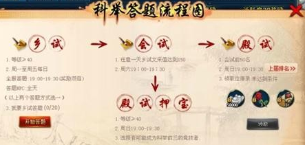 等级达到40级之后,便可去参与乡试答题。每天答题后根据正确答题数也获得一定的文采值。而文采值达到150将获得会试资格。之后再次将于周六19:00~19:30进行会试。前50能参加殿试。