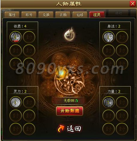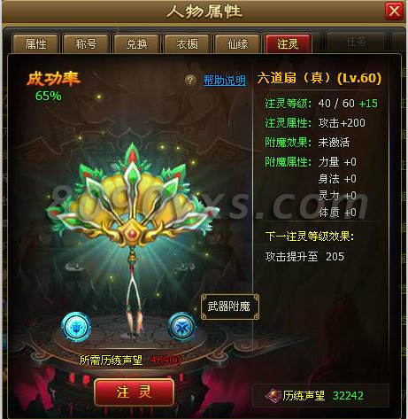 六道扇:注灵等级40/60,注灵属性:攻击+200,附魔效果:未激活。力量+0,身法+0,灵力+0,体质+0。