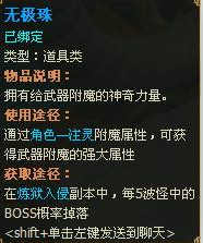 当然,附魔也是需要一定的材料,就是无极珠,无极珠可以在50炼狱副本中有几率掉落,附魔扩展卷可以通过神秘商店来获得。