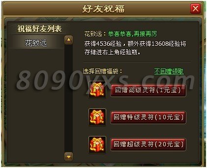 选择回赠福袋:回赠高级灵符(1元宝),回赠特级灵符(10元宝),回赠超级灵符(20元宝)