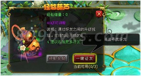40级可领取经验葫芦:通过好友之间的升级祝福,可增加经验瓶的经验。