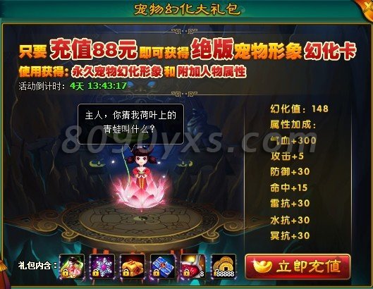 活动内容:活动时间内,充值880元宝,即可获得绝版莲花宝宝幻化大礼包,可获得:莲花宝宝幻化卡、99朵浪漫雪花、中型气血包、中型法力包、腊八粥x8、绑定铜币x88888