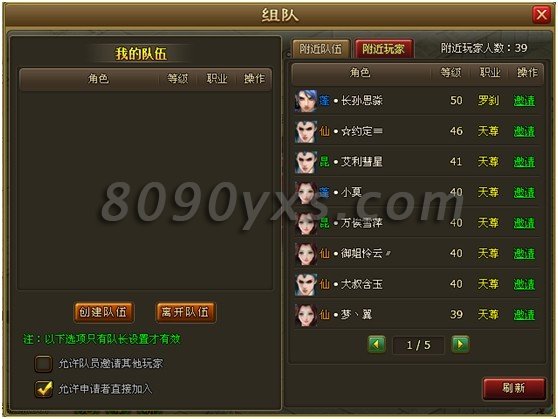 2)点击游戏菜单界面的【组队】或使用快捷键T打开组队界面,在【附近玩家】处就可以看到周围的其他玩家,点击【邀请】按钮,对方同意后,组队完成。