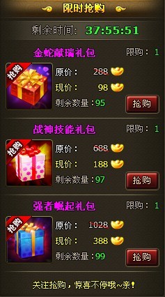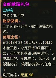 限时抢购中,98元宝即可获得金蛇献瑞礼包,只要98元宝,金蛇献瑞礼包拿回家,金蛇献瑞福气多多礼物多多!