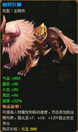 醉西游幽冥狂狮:霸气侧漏的眼神,壮硕的体格,以及稍稍风中凌乱的发型,让看到它的人都为之所征服。获取途径:商城购买。要花费888元宝。