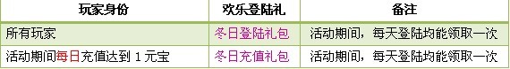 活动规则:活动期间,等级≥30级的玩家即可通过活动界面领取一份冬日登陆礼包,当天充值的玩家还可以额外领取一份相应的专属冬日充值礼包!